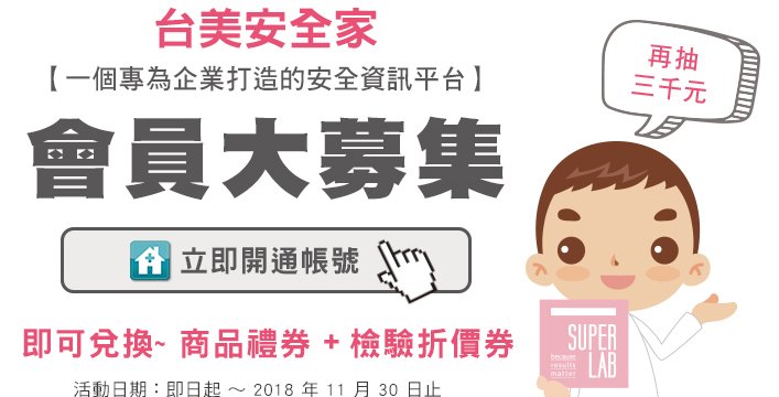269 月 2018 by superlab.tw 台美安全家會員募集活動 檢驗優惠專區, 活動資訊, 焦點訊息 台美安全家 會員大募集 開通帳號即可兌換商品禮券+檢驗折價券,再抽三千元 台美安全家自 2016 年推出後,廣受各界好評,尤其是獨創的法規測項查詢系統,彙整上萬筆法規資料,查詢衛生標準,同時取得專業檢測建議、法源依據和實驗方法,更可依照測項一鍵線上報價。 ... Read More