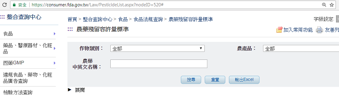 步驟 1、點選連結,前往 食品藥物消費者知識服務網 – 殘留農藥安全容許量標準 或依照路徑前往,路徑:食品藥物消費者知識服務網 > 整合查詢中心 > 食品 > 食品法規查詢 > 農藥殘留容許量標準。