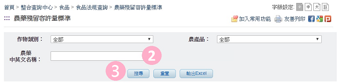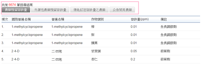 小提醒: 搜尋結果頁面有三個選項,分別是「殘留農藥安全許量」、「得免訂定容許量之農藥」、「公告禁用農藥」可按需求選擇。