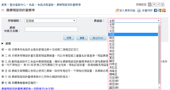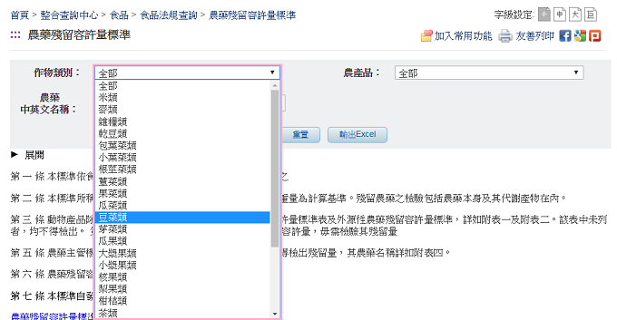 如果想知道自己的作物屬於哪類農產品,請使用「農藥殘留容許量標準附表一至附表五(中文版) 」。