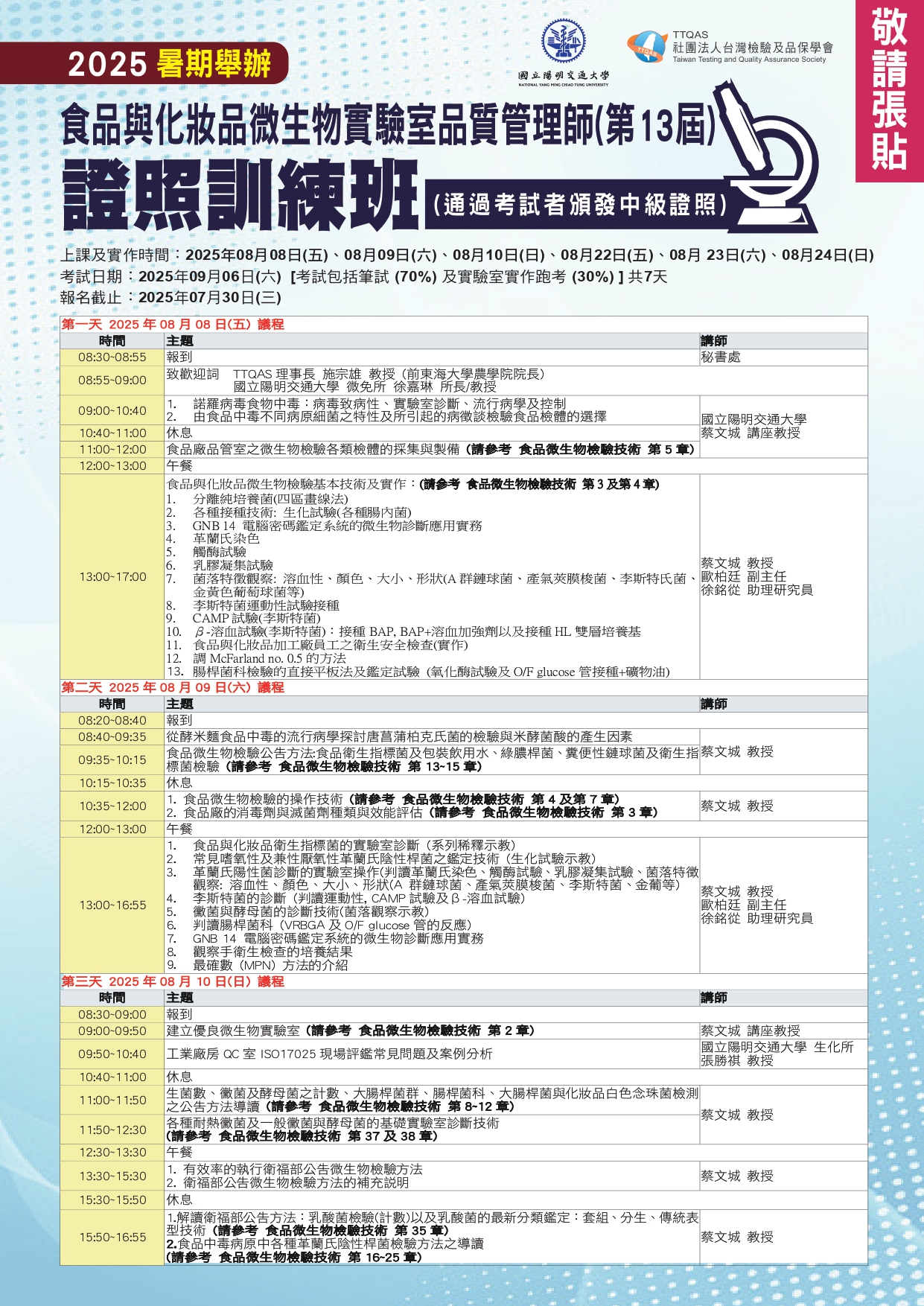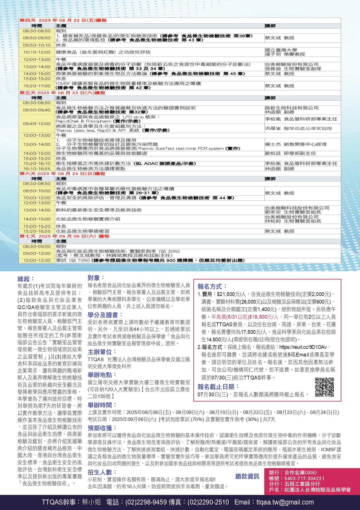 2025 暑期食品與化妝品微生物實驗室品質管理師證照訓練班