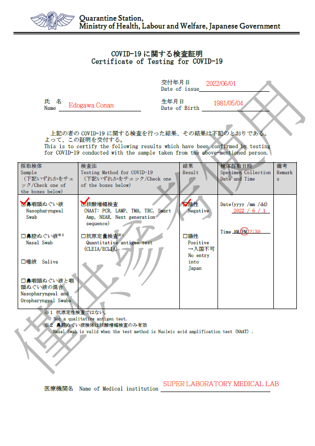 - 除了檢測證明書的發行日以外,同時須記載檢體採集日期和時間(該時間必須在出發前往日本前的 72 小時內)。