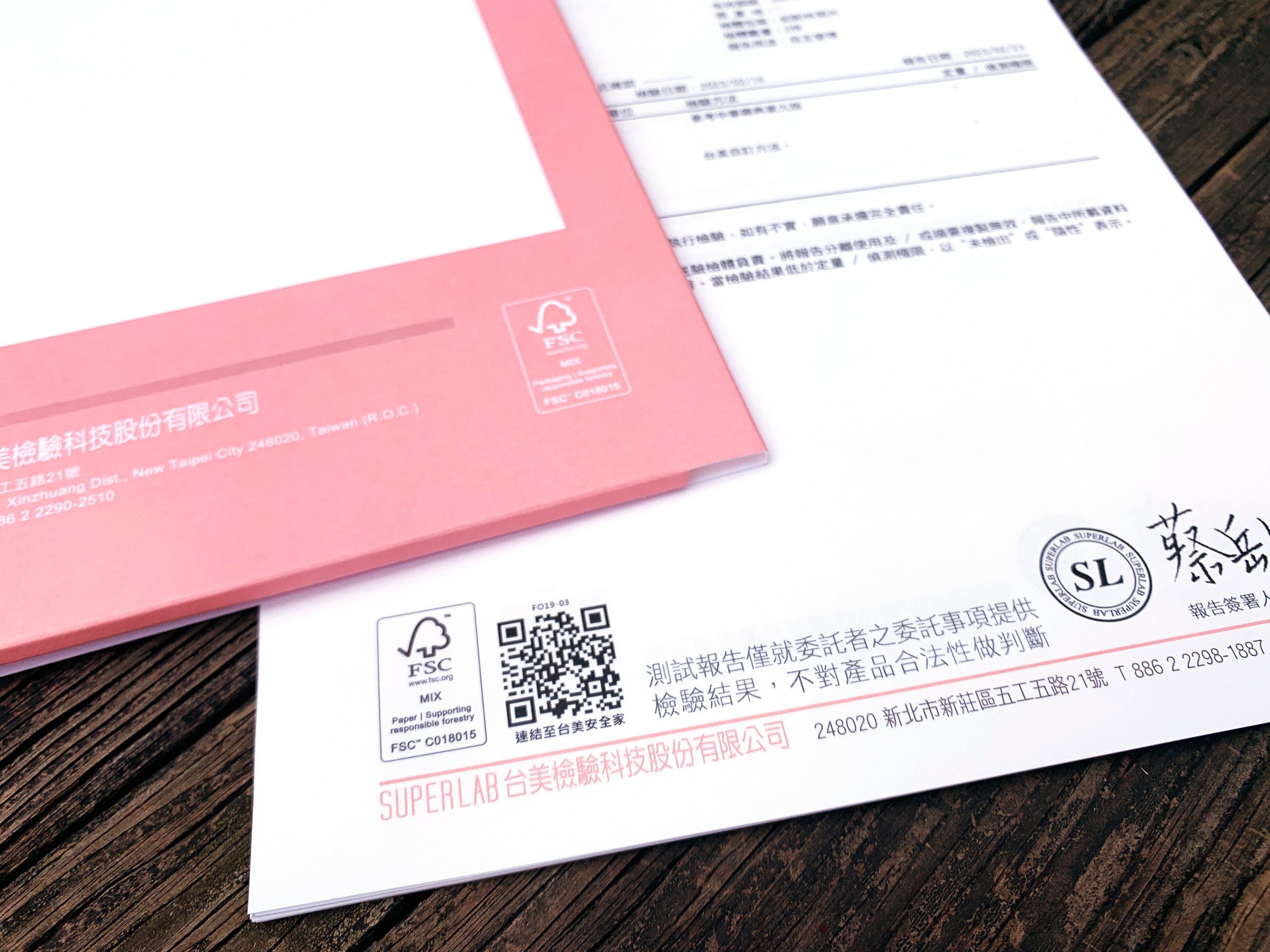 FSC為全球最受認可的國際森林驗證標準之一,他們制定了森林永續經營的10項原則、56個標準和木材加工的產銷監管鏈標準,追蹤木製品從森林到消費者手上的整體流程,從而可以控制木材的合法性及可持續利用。選擇具有FSC標章的林木產品,便可確認這些產品的林木來源都是合法砍伐且以永續方式經營的良好管理森林,符合可持續性森林管理、可追溯紙材來源,還會每年追蹤稽核產銷監管鏈,拒絕濫伐雨林、破壞生態等行為。台美檢驗響應政府2050淨零排放的目標,選擇提高紙張成本,使用FSC印刷紙提供給所有的客戶,展現對地球永續發展的責任感和行動力。