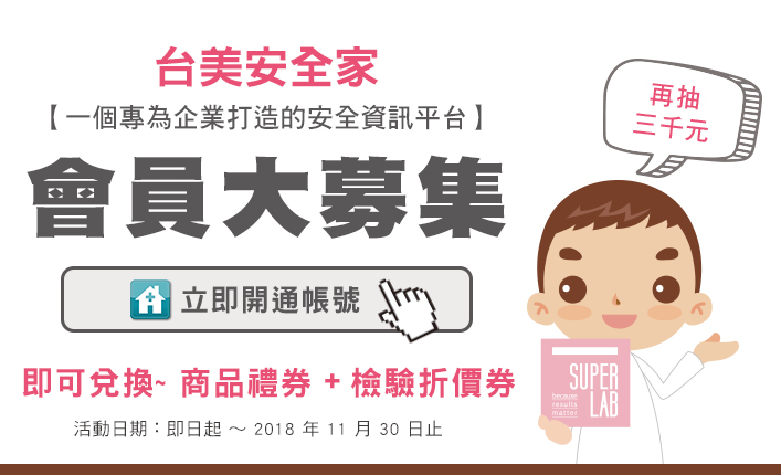 - 參加資格,以檢驗報告出具日期 2018/04/01 ~ 2018/11/30 為限之台美客戶,並需於活動期間完成活動步驟,包含於台美安全家網站上註冊一組帳號,清楚完整填寫「檢驗報告管理」服務開通申請書,加蓋申請單位之公司大小章,以郵寄掛號、傳真或 email 方式回傳,並收到台美檢驗發出之開通 email 通知,完成以上動作的前 100 名,符合兌換資格。
