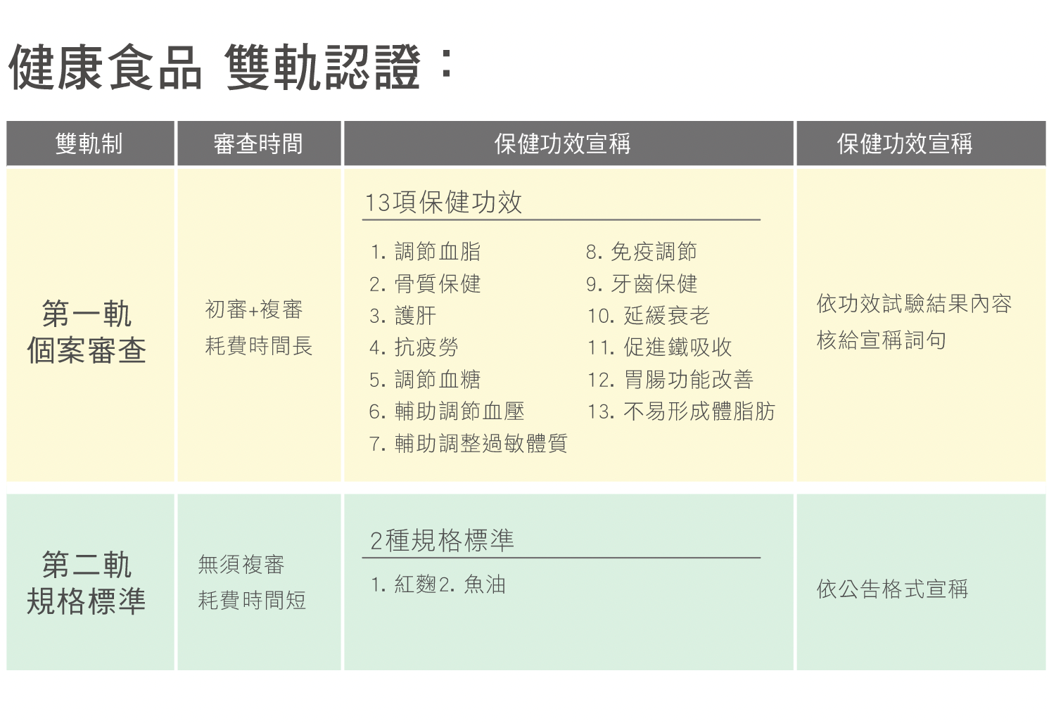 依據「健康食品管理法」,健康食品為「具有保健功效,並標示或廣告其具該功效之食品,且具有實質科學證據之功效,非屬治療、矯正人類疾病之醫療效能」,是具有法律效力之代表名詞,需經過事前審查才可宣稱保健功效,目前台灣採雙軌審查機制。