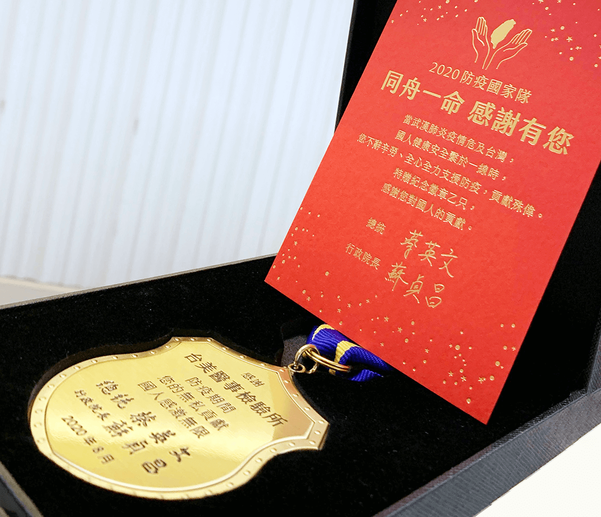 由蔡英文總統親自頒發「防疫獎章」予全國44位對防治COVID-19(武漢肺炎)工作卓有貢獻的個人與團體代表,感謝幕後防疫英雄,義無反顧地在各行各業努力,為全民編織起縝密的防疫網絡,守護我們的家園,為臺灣在全球疫情浪潮之中,創造珍貴又安定的力量。