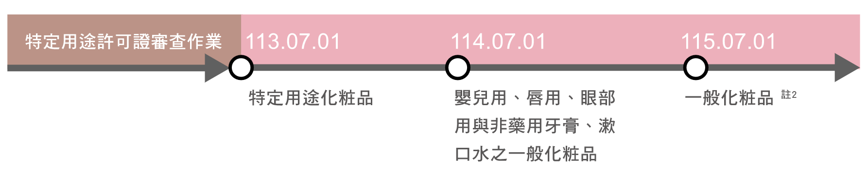 符合化粧品定義者註1,依產品類別不同依不同時程完成。