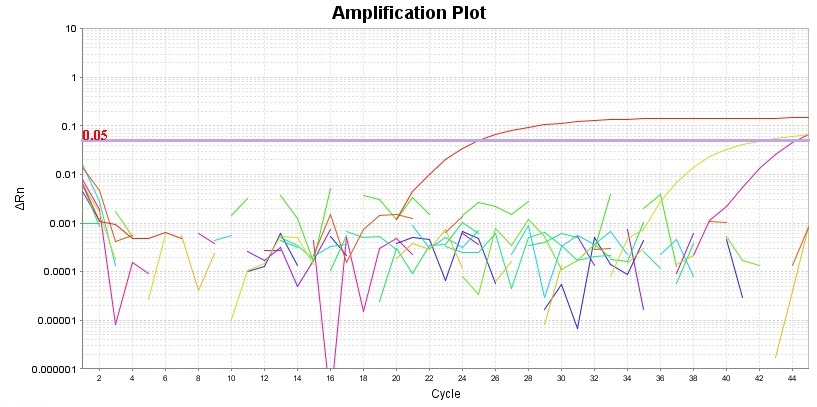 每次執行試驗時,除了檢體之試驗組外,還需搭配陽性對照組、陰性對照組及空白對照組,確認試驗執行之有效性。而檢體 DNA 之增幅產物螢光分析圖須與陽性對照組螢光分析圖進行相互比對,當檢體 DNA 與陽性對照組之 PCR 螢光分析圖皆出現經由探針所產生之螢光增幅曲線,即確認該 Real-time PCR 增幅產物為測試項目之基因片段,因此確認檢體中含有該目標檢測成分。