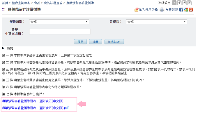 如果想知道自己的作物屬於哪類農產品,請使用「農藥殘留容許量標準附表一至附表五(中文版) 」。