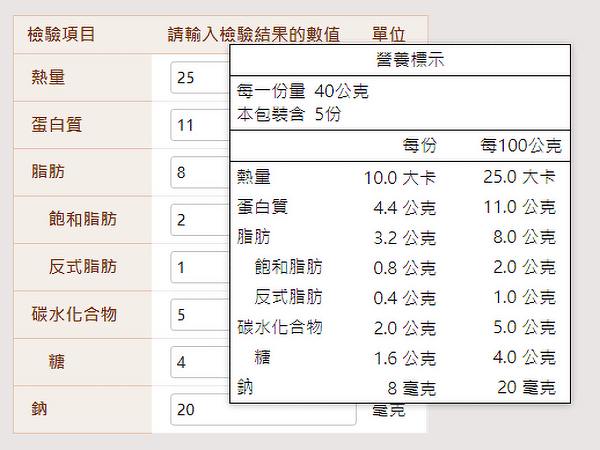 - 一般食品營養標示換算系統( 進階版 含自願性檢驗項目)