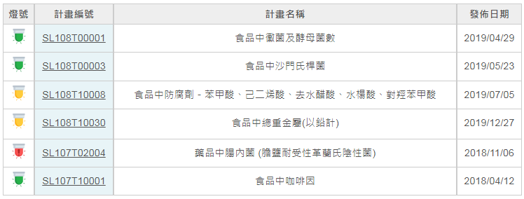 • 黃燈:食品中防腐劑、食品中總重金屬(以鉛計),一年未有參加資訊。